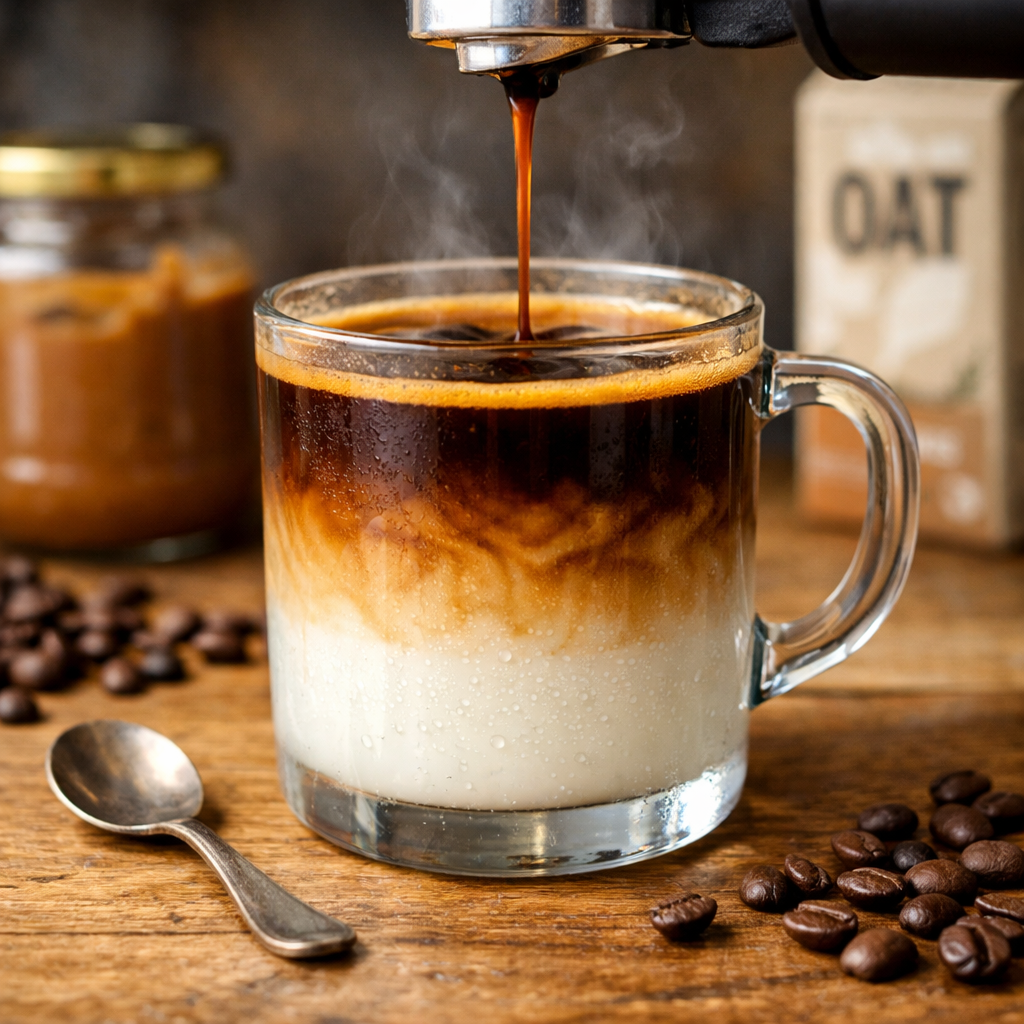 O erro comum é despejar o leite de coco gelado direto no café fervendo. A diferença brusca de temperatura e a acidez do grão fazem a gordura do leite se separar. Siga este método para ter um café digno de cafeteria: