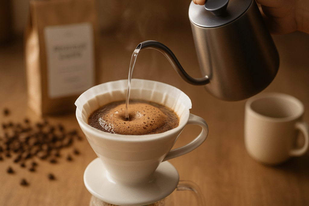 Um dos “truques” mais usados por baristas profissionais está no bloom — a pré-infusão. Esse momento inicial em que a água entra em contato com o café moído libera bolhas e aromas que fazem toda a diferença.