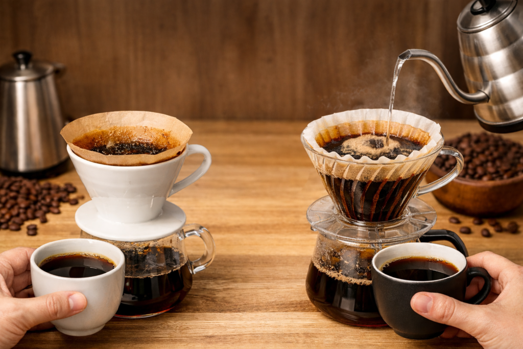 Essa comparação faz parte da tabela comparativa de métodos de preparo de café, onde estão reunidas as principais técnicas em uma única visão.
